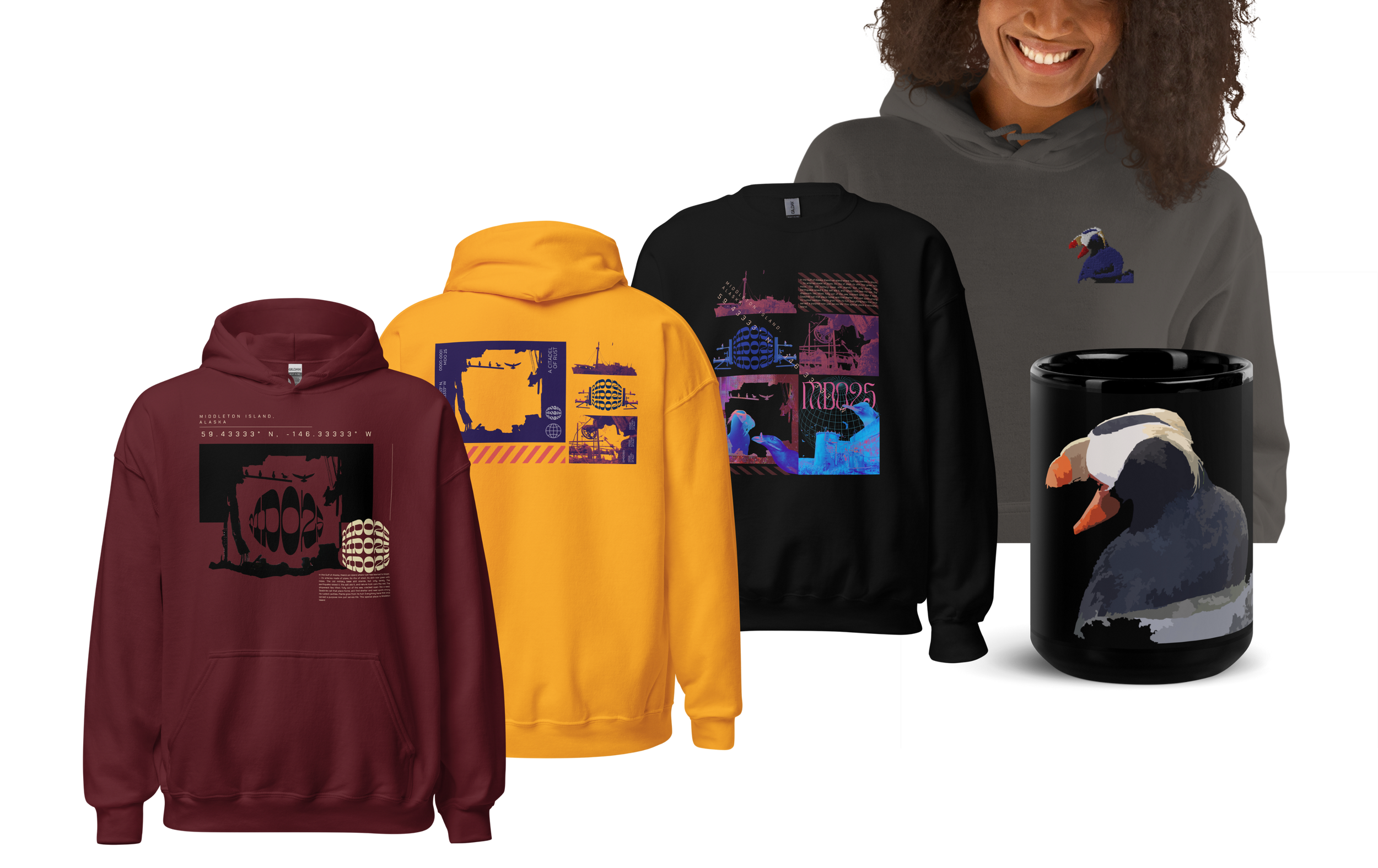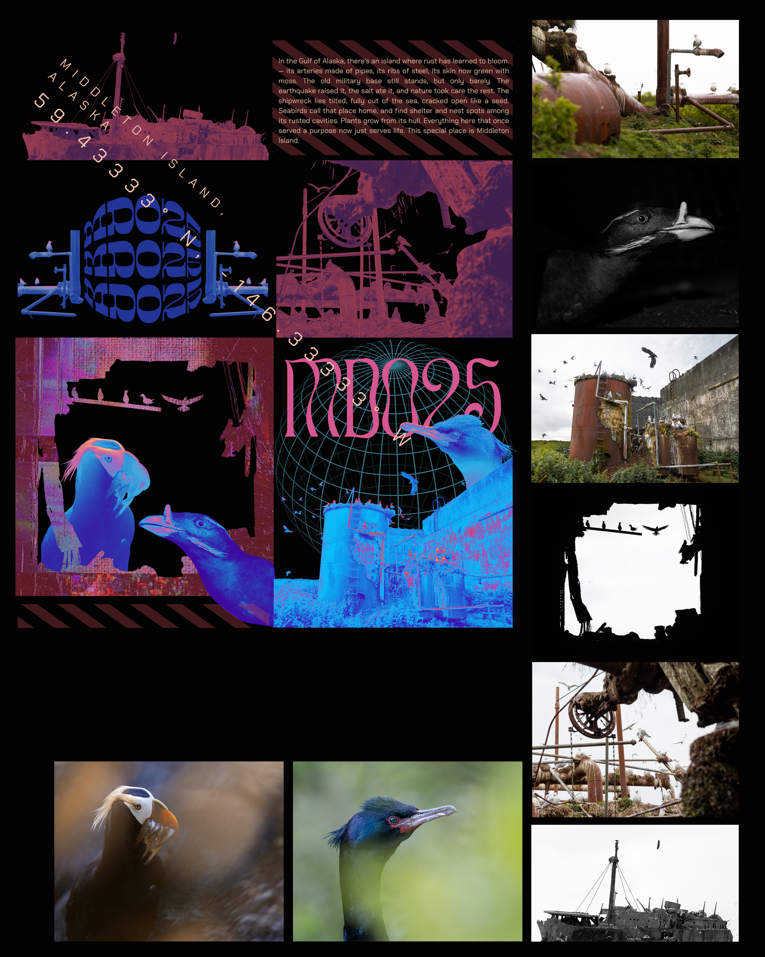 MDO25 is a streetwear project born on Middleton Island, Alaska — a remote outpost where rusted barracks, shipwrecks, and fractured metal have become home to thriving wildlife. Each design reimagines this coexistence through bold, graphic reinterpretations of eight original photographs taken on the island. Stamped with its coordinates and the MDO25 insignia, the collection merges industrial relics with organic revival — a clothing revolution where the wild takes back the machine.