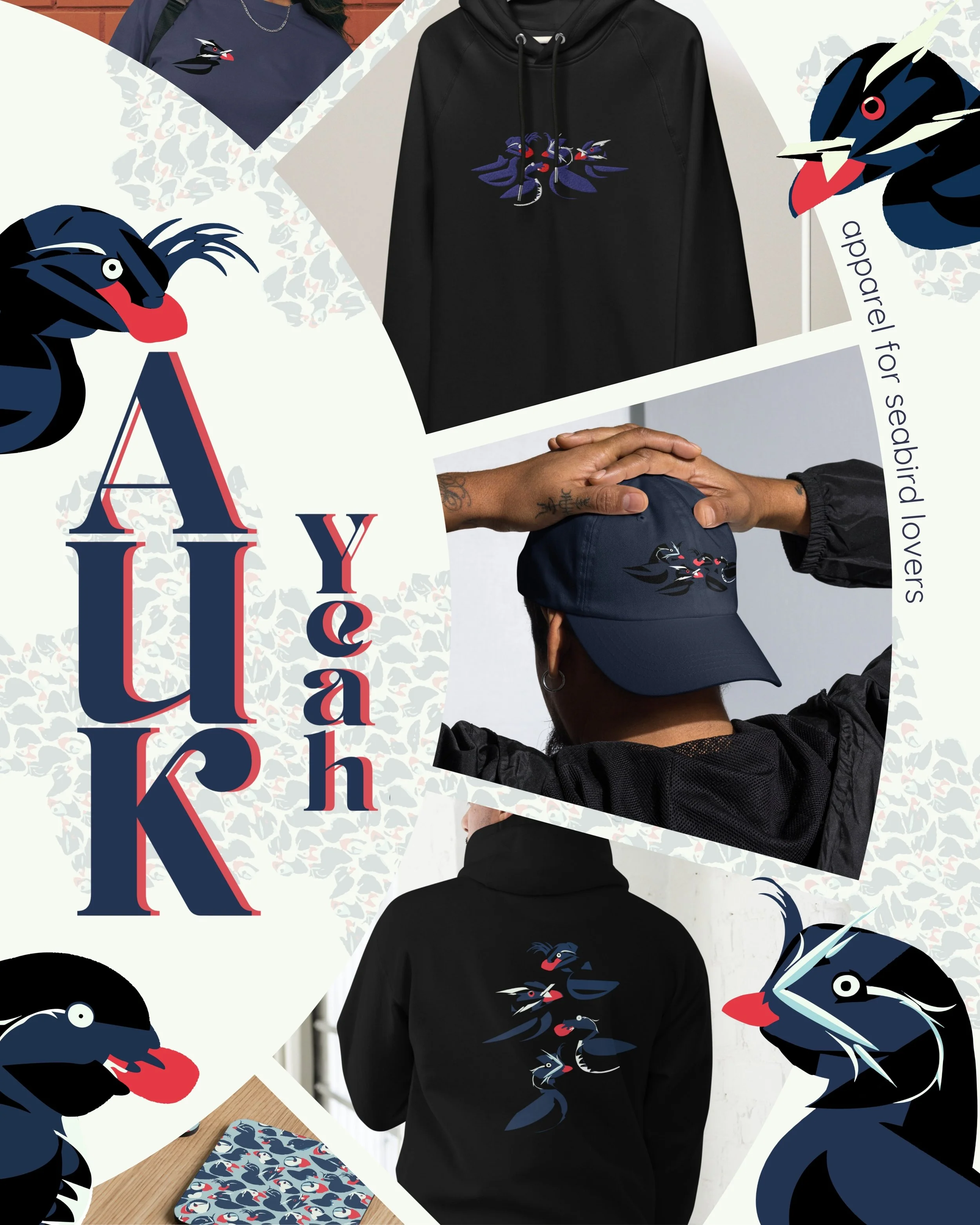 Auk Yeah is a collection from a passion for seabirds and the places they call home, each design is built from layered shapes that capture their character, energy, and freedom. By using negative space as a building block, each design blend into the base colour of each clothing piece.